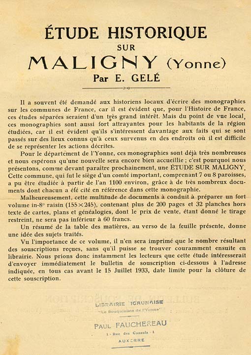 Bulletin de souscription pour l'Histoire de Maligny de E. GELÉ en 1933