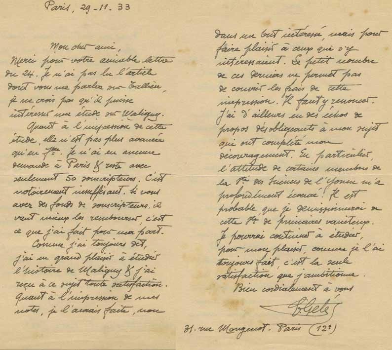 Lettre d'Edmond Gelé à Louis Denis , notaire à Ligny-le-Chatel