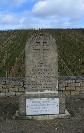 l'immense maquis des Isles Ménéfrier ". A un kilomètre au nord de Chablis, au bord de la route, sur le lieu du drame, une stèle à croix de Lorraine a été élevée à la mémoire des quatre victimes, pour la Libération de la France de l'occupation hitlérienne. Elle comporte l'épitaphe : GLOIRE IMMORTELLE AUX MARTYRS DE LA RESISTANCE |