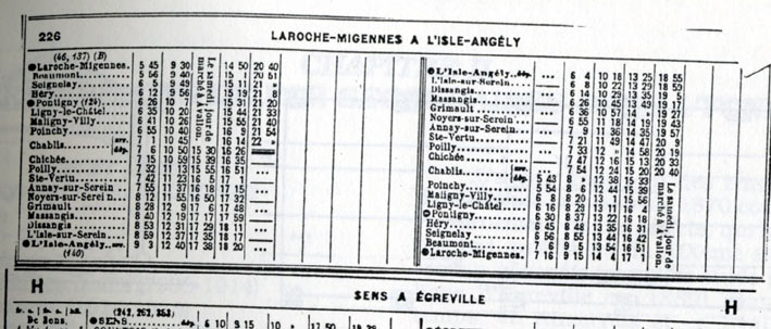 de trains facultatifs. compte tenu de ces sujestions, la Compagnie CFD mettait en ligne trois aller et retour Laroche-L'Isle -Angely quotidiens + 1 AR Chablis-laroche, assurés par les trains mixtes, couvrant les 74 km du parcours en 3h32 au mieux ; près de 4 heures au pire. La consultation des horaires de 1908-1914-1929 démontre qu'il n'y eut guère de progrès . Cette lenteur était imputable à la formule du train mixte, voyageurs-marchandises ( M.V selon l'abréviation ferroviaire, qui disait bien ce qu'elle voulait dire " les marchandises d'abord" ) . Car tel était bien le cas, les voyageurs étant invités à participer aux ébats de la locomotive manoeuvrant dans les gares, ici pour laisser un wagon, là pour en prendre deux ( et aussi prendre du retard ). " |